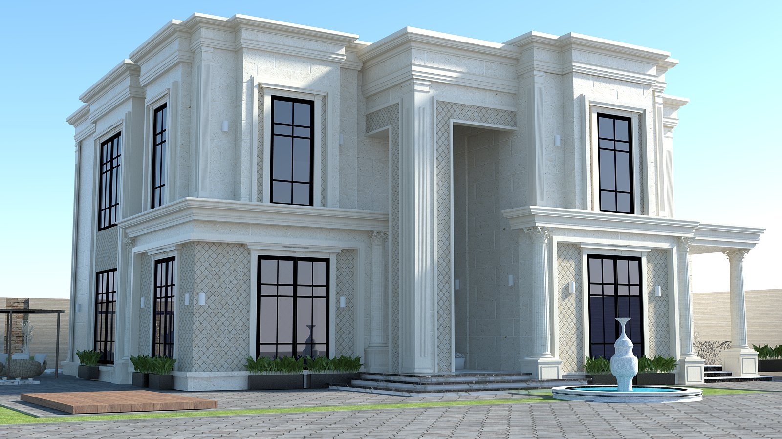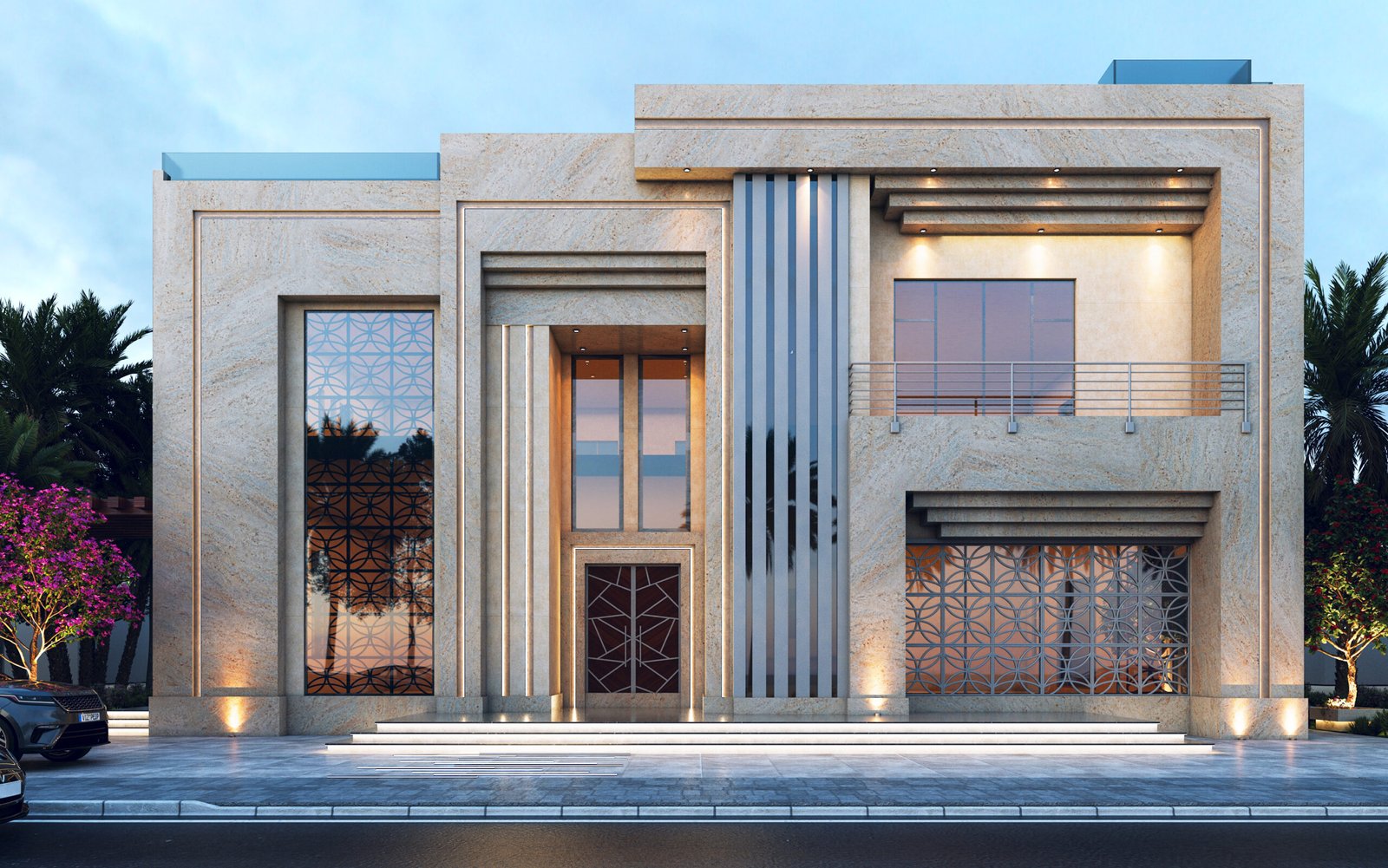 تعتمد على تكوين متزن وكتل واضحة، مع إبراز العناصر الرأسية من خلال أعمدة وتفاصيل معمارية أنيقة. الواجهة مكسوة بالحجر الفاتح مع زخارف هادئة ونوافذ رأسية بإطارات داكنة تعزز الإضاءة الطبيعية