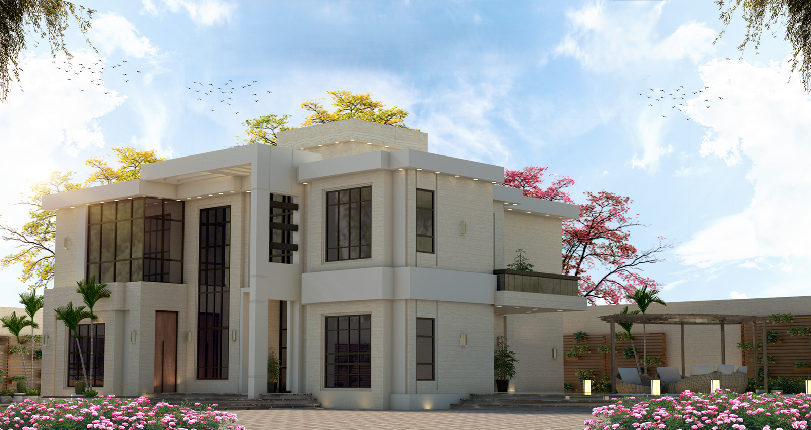 فيلا سكنية بتصميم حديث تعتمد على تداخل الكتل الهندسية والخطوط الواضحة، مع إبراز الإطارات المعمارية والبروزات لإضفاء عمق بصري وحركة متزنة